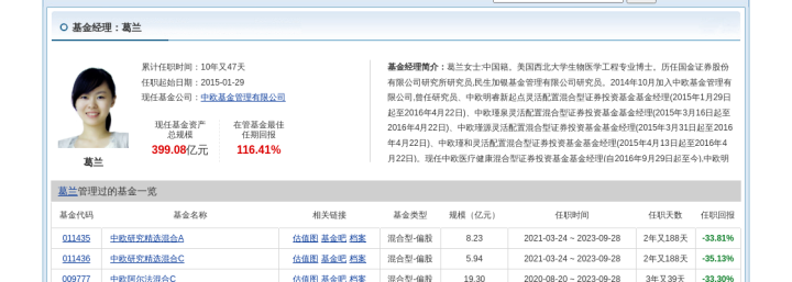 简历显示,葛兰女士:中国籍。美国西北大学生物医学工程专业博士。历任国金证券股份有限公司研究所研究员,民生加银基金管理有限公司研究员。2014年10月加入中欧基金管理有限公司,曾任研究员、中欧明睿新起点灵活配置混合型证券投资基金基金经理(2015年1月29日起至2016年4月22日)、中欧瑾泉灵活配置混合型证券投资基金基金经理(2015年3月16日起至2016年4月22日)、中欧瑾源灵活配置混合型证券投资基金基金经理(2015年3月31日起至2016年4月22日)、中欧瑾和灵活配置混合型证券投资基金基金经理(2015年4月13日起至2016年4月22日)。现任中欧医疗健康混合型证券投资基金基金经理(自2016年9月29日起至今),中欧明睿新起点混合型证券投资基金基金经理(自2018年7月12日起至今)、中欧阿尔法混合型证券投资基金基金经理(2020年8月20日起至2023年9月28日)。