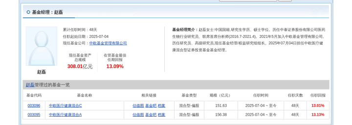 简历显示,赵磊女士:中国国籍,研究生学历、硕士学位。历任中泰证券股份有限公司医药生物行业研究员、联席首席分析师(2016.7-2021.4)。2021年5月加入中欧基金管理有限公司,历任研究员、高级研究员,现任基金经理/权益研究组组长。2025年07月04日担任中欧医疗健康混合型证券投资基金基金经理。